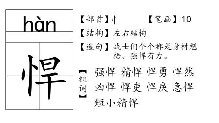 其本义为勇猛,如“强悍”、“精悍”;引申义为凶暴,如“悍然”、“凶悍”;也可形容强劲,如“湍悍”。常见组词有:悍勇、悍将、悍吏、悍妇等。